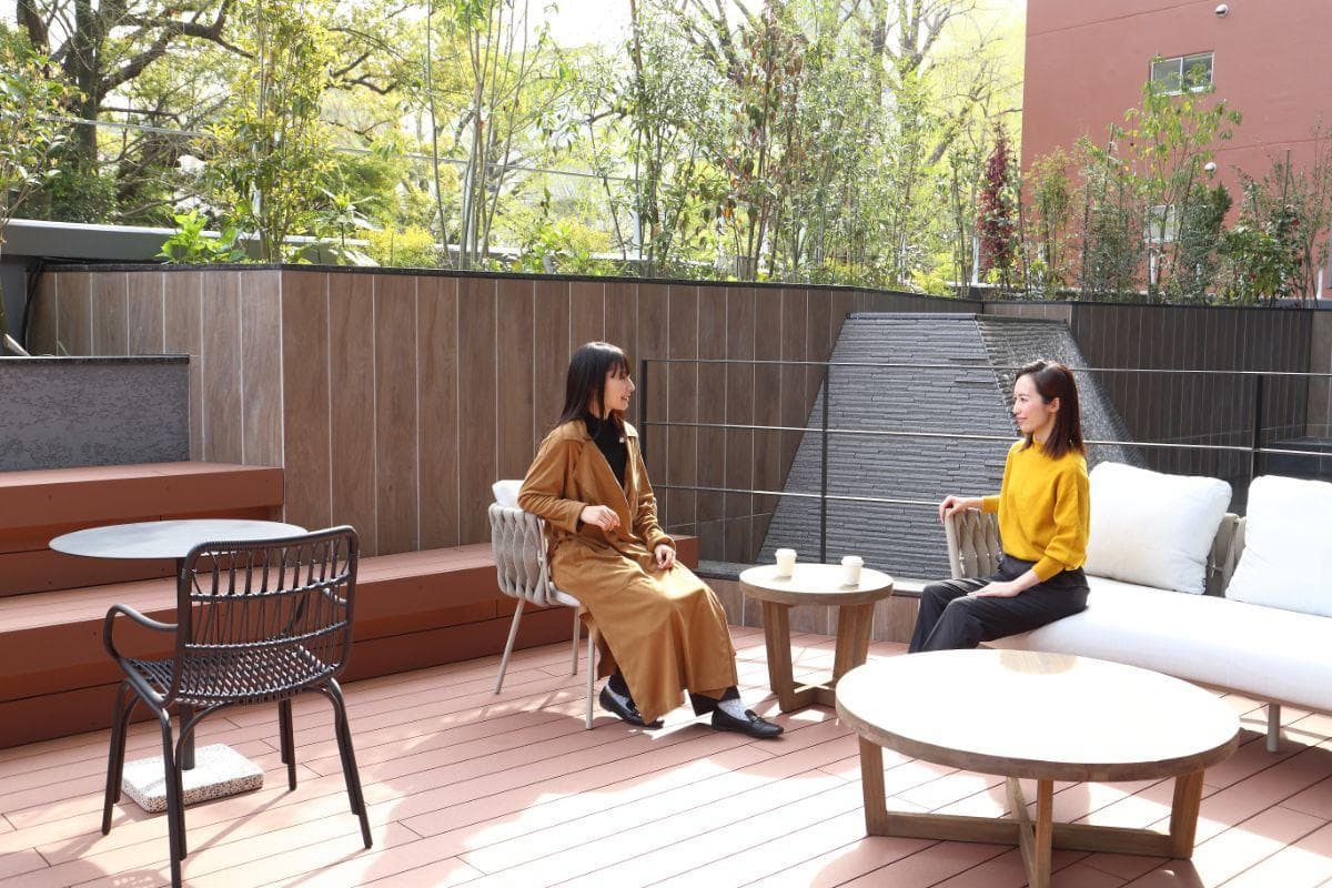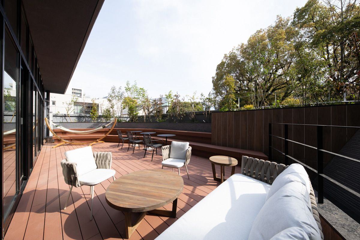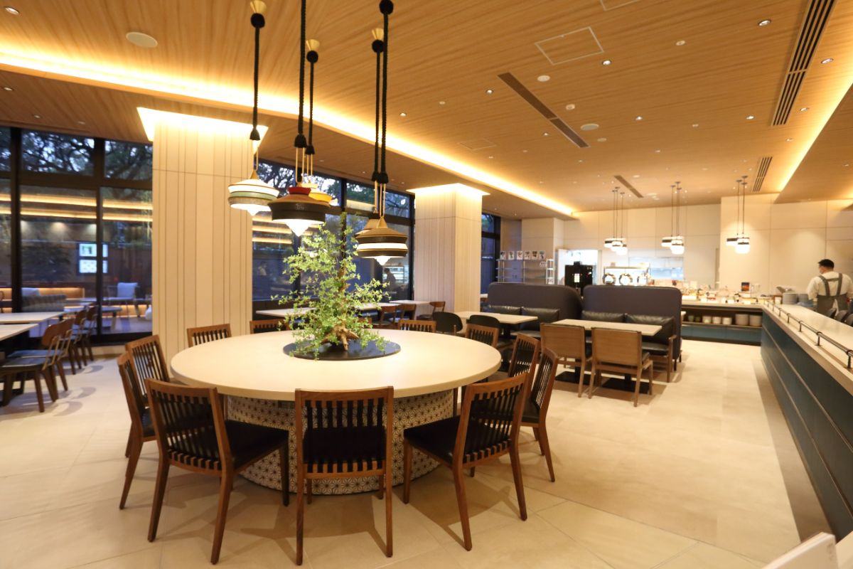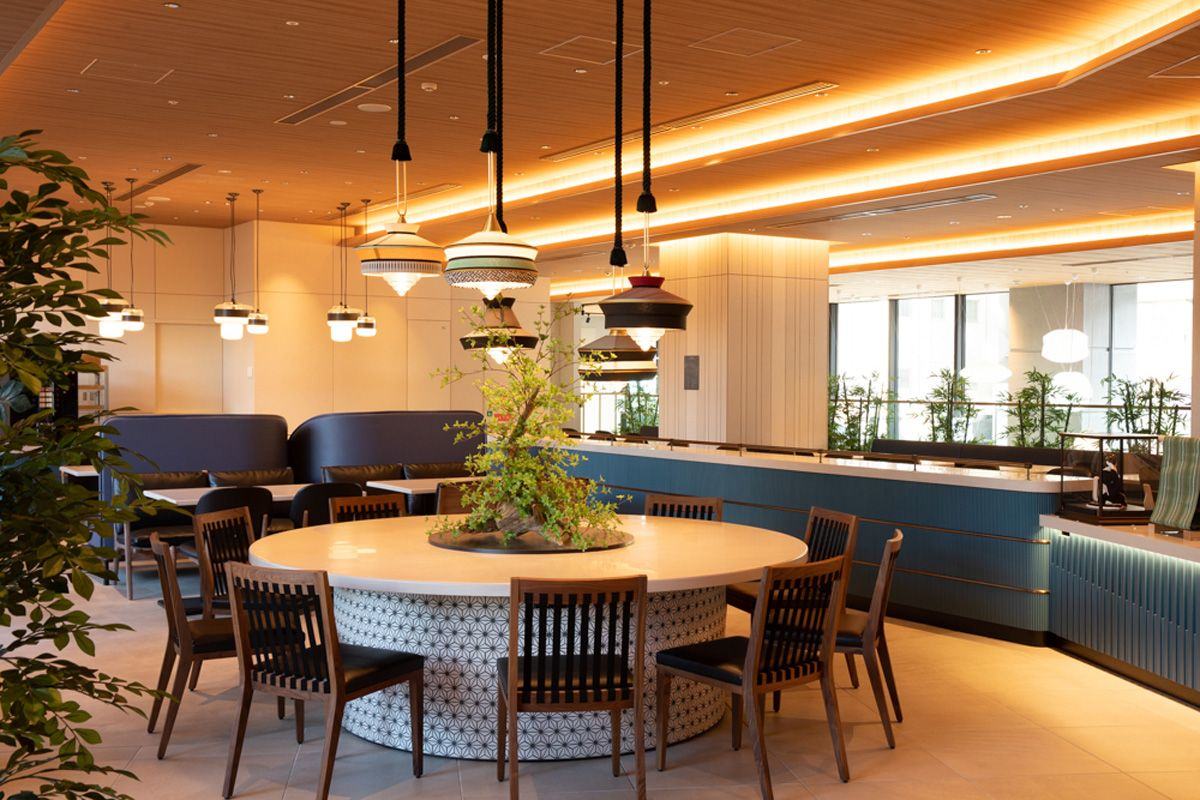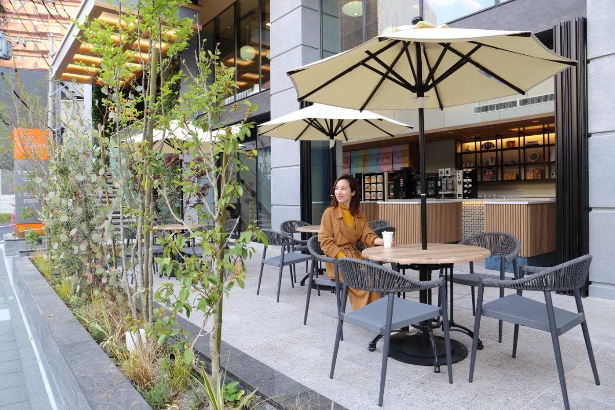 ロビーのある2階は、早朝はホテル宿泊者向けの朝食会場にもなる、コミュニティスペース。宿泊者以外のビジネスパーソンもワーキングスペースとして利用できます(宿泊者:24時間利用可能、宿泊者以外:6~24時まで利用可能)。コンセントが設置されたカウンター席から複数人で座れるソファ席まで、さまざまな席が用意された屋内のほかに、緑に囲まれた開放感のあるテラス席も。