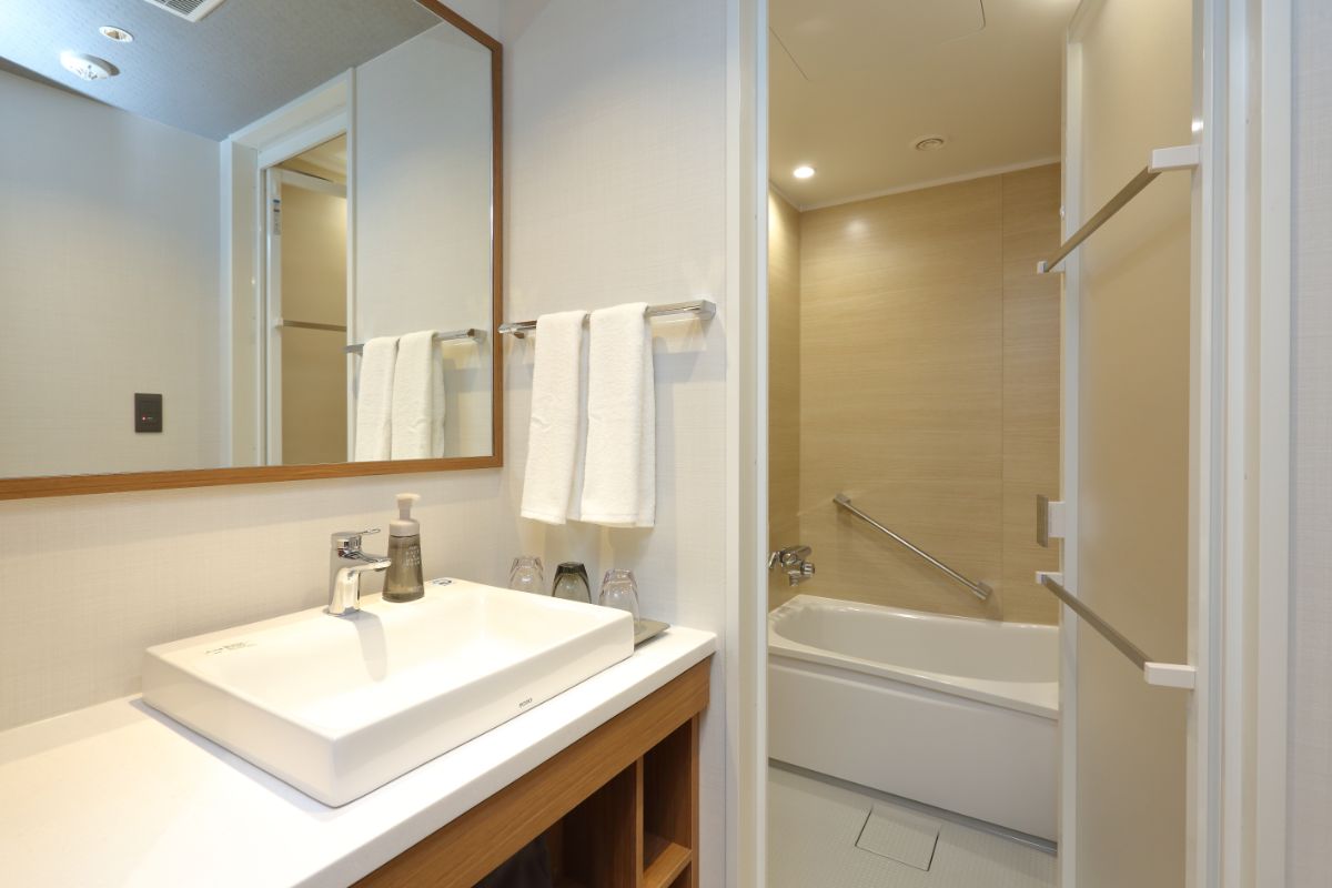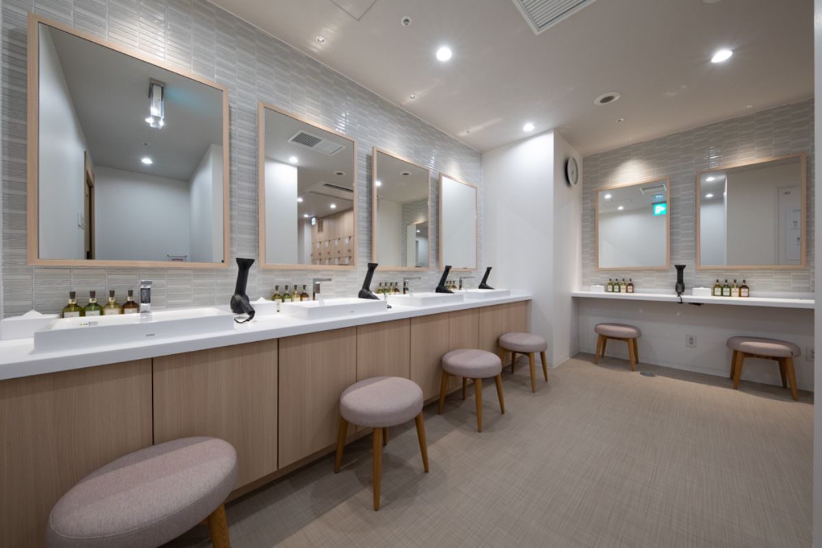 広々としたパウダールームには、DHCの人気シリーズ「オリーブゴールド」のアメニティが並びます。クレンジングや乳液だけでなく、ボディミルクもあるのがうれしいですね。ヘアブラシやコットンセット、ボディタオルなどのアメニティも豊富に取り揃えられているので、とっても便利♪ さらに、髪がサラサラになると話題のMAGNETHairProのドライヤーも常備。速乾ドライヤーなので、短時間でサッと髪を乾かせます。