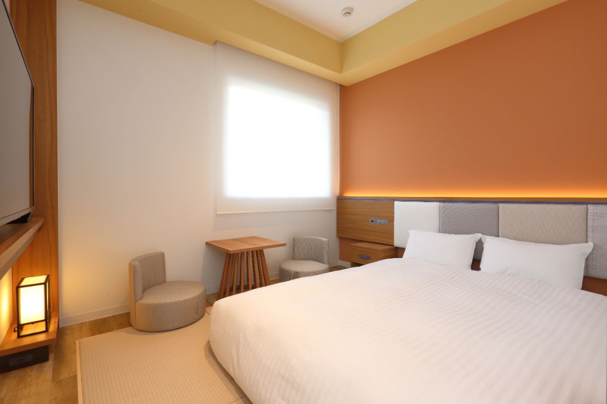 ダブルサイズのベッドが設えられたこちらの「小上がりダブル」は、1~2名で利用。ベッド周りに畳が配置されていて、リラックスできるお部屋です。座面の低いイスとテーブルもあり、靴を脱いで、まるで自宅にいるかのようにくつろげます。
