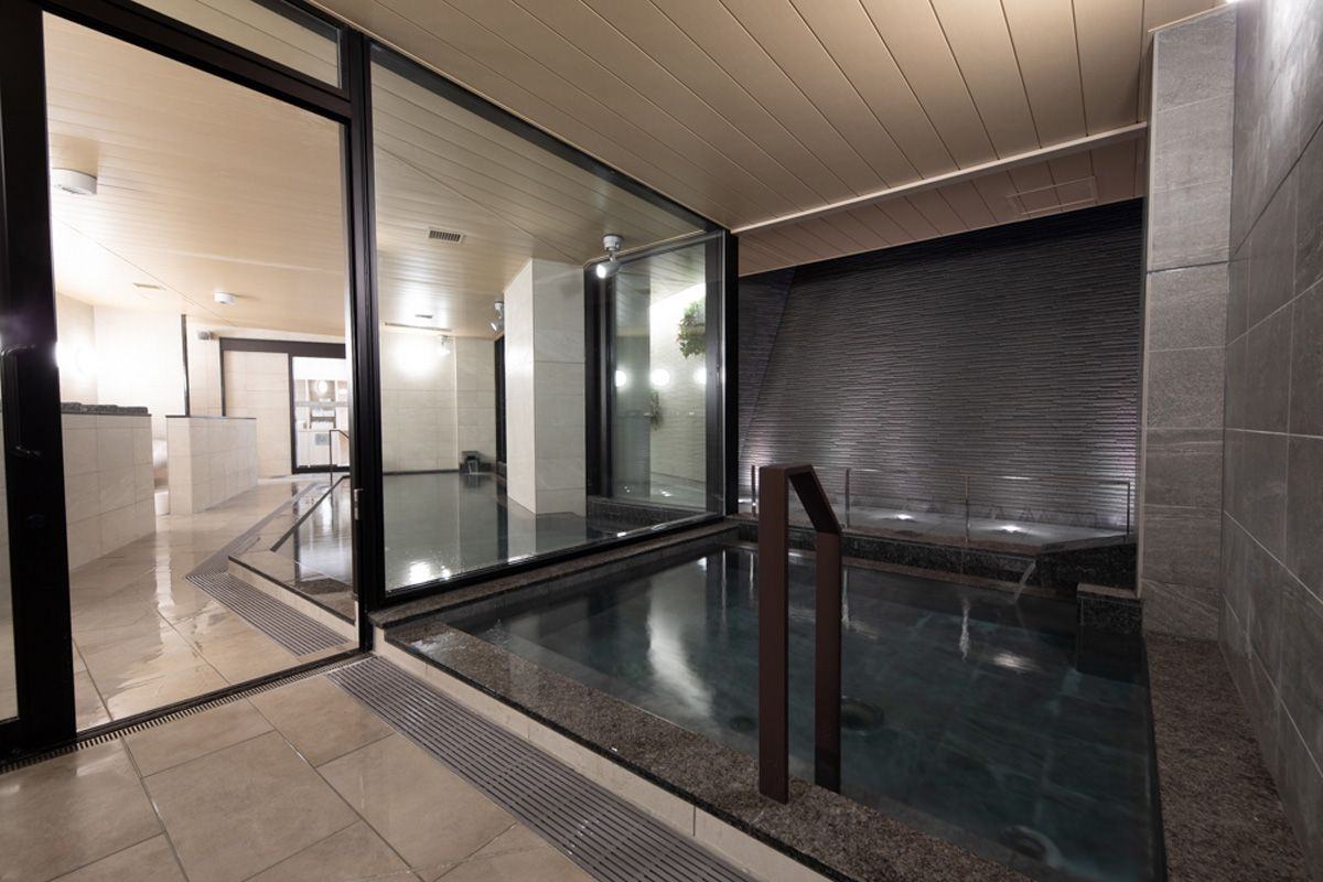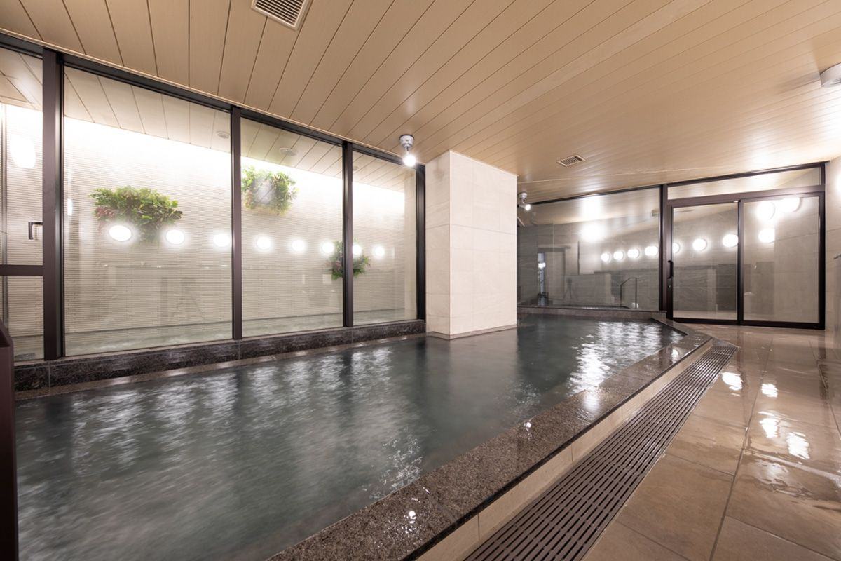 内湯と全天候型の半露天風呂がある大浴場。浴槽からアクアウォールとグリーンを眺めてゆっくり。心地よい水の音が響く癒やしの空間です。大浴場は15時~翌1時、6時~9時30分に利用できて、好きな時間にのんびりと旅の疲れを癒やせます。大浴場にはルームキーをかざして入るので、深夜や早朝の入浴も安心です。
