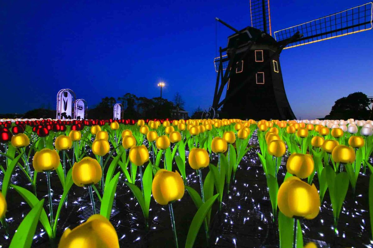 「フラワーロード」では、風車の前にチューリップが咲き誇る絶景が広がり、まるで春のオランダにいるような気分。また夜には、音楽とともに幻想的なチューリップのライトが咲き並ぶ 「光のチューリップガーデン」を見ることもできます。きらめくイルミネーションとチューリップとのコラボレーションは必見です。