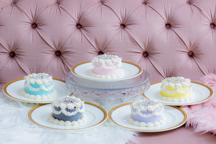 オプションの「クラウンケーキ」1500円は、淡い色合いの5色から推しカラーが選べます。カラーはレッド、ブラック、イエロー、パープル、ブルーで、イチゴのティラミス。こちらも要チェックです。推し活女子には見逃せません。