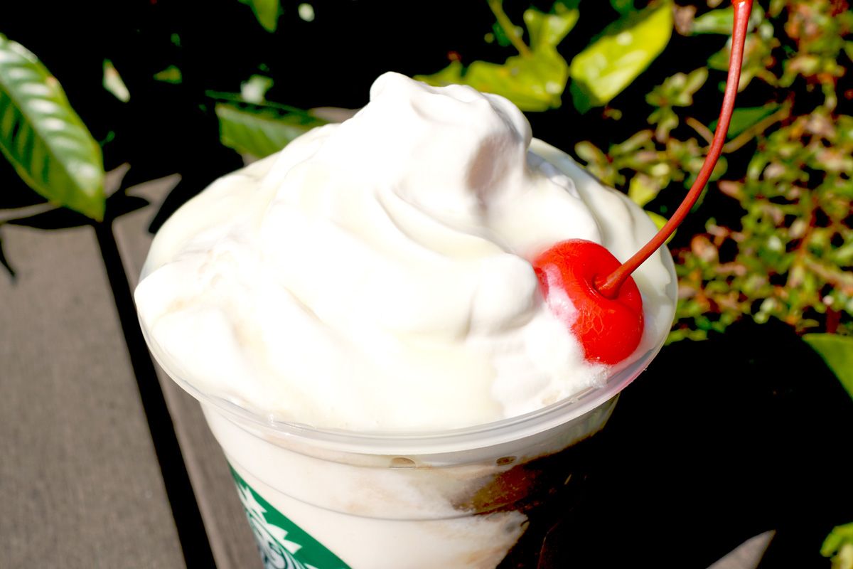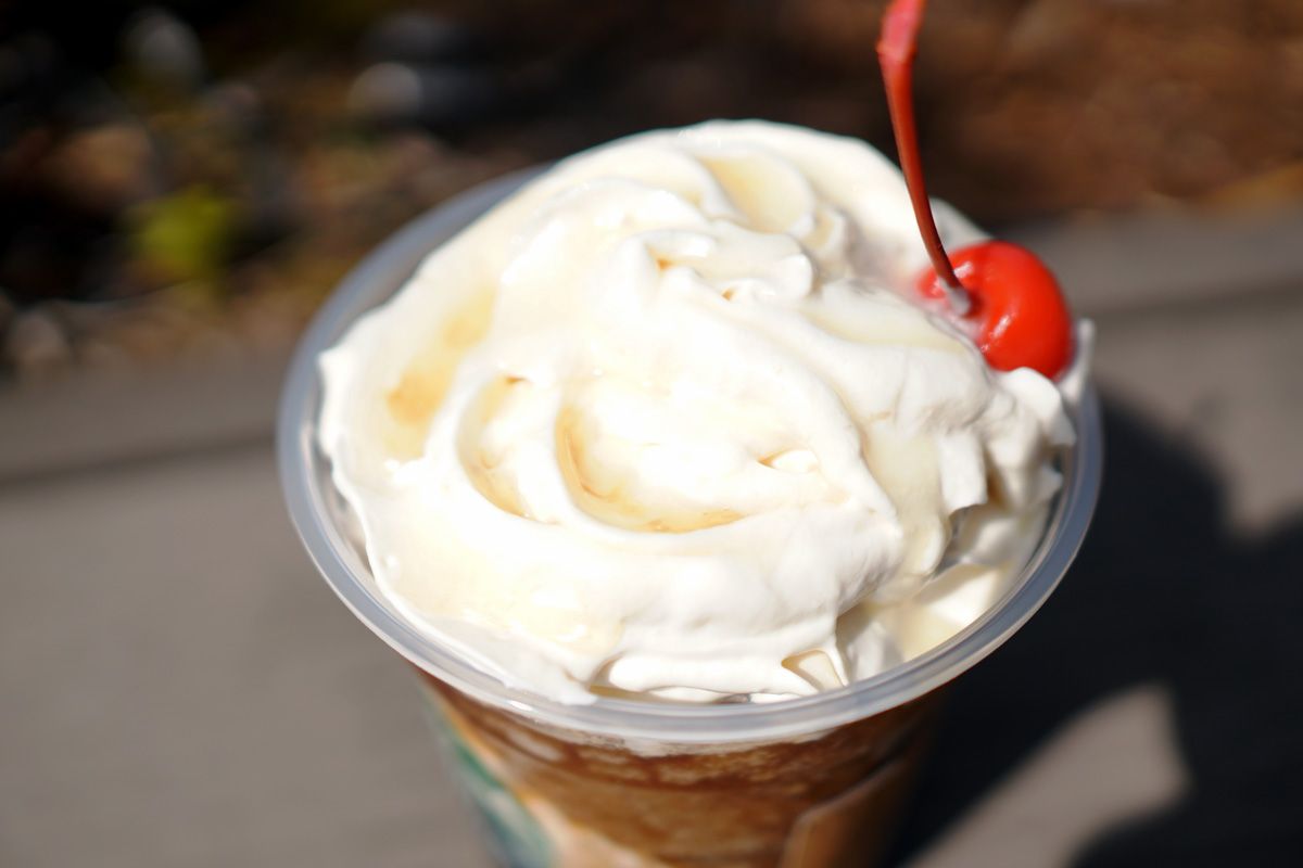 トッピングとカップの底には、スターバックスらしく、エスプレッソでコーヒーの香りとコクを加えたバニラ風味のホイップクリームが添えられています。さらに、バニラアイスフレーバーソースを回しかけ、真っ赤なチェリーも。