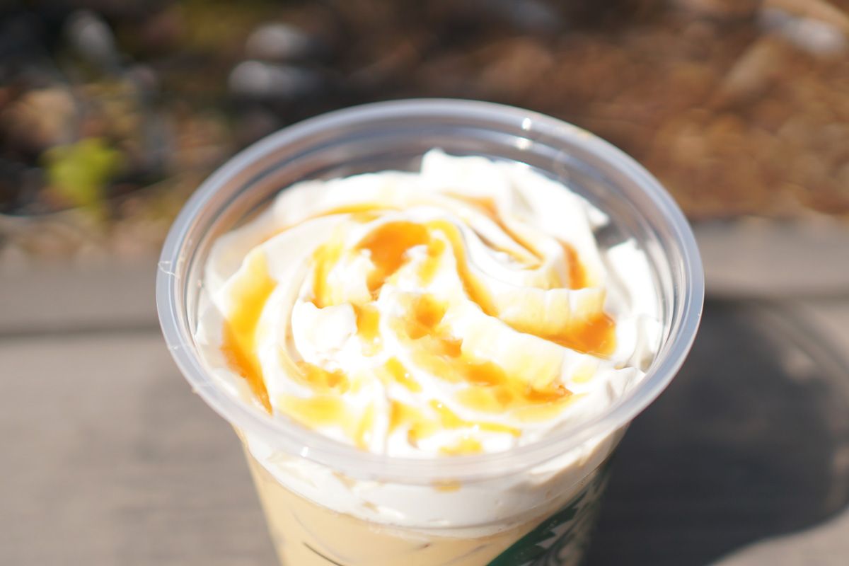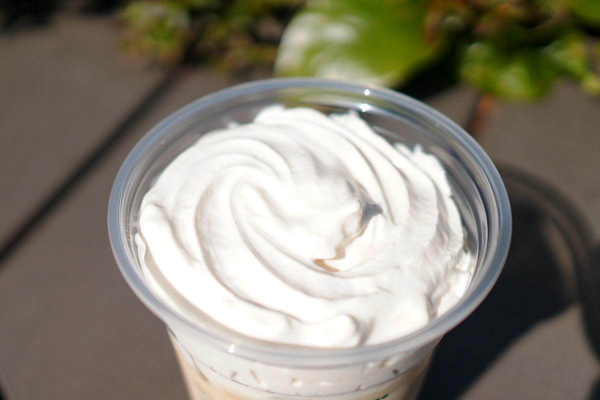 トッピングのバニラ風味のホイップクリームと、バニラアイスフレーバーソースの味わいもいい! 真っ白な見た目にもかかわらず、ほんのりコーヒー味がして、いい感じに甘みとコクのアクセントを加えてくれます。