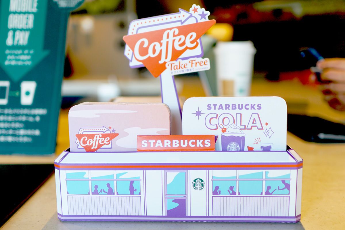 ドリンク提供台の横には、今回のプロモーションのコースターも! アメリカのロードサイドにあるコーヒーショップを思わせるパッケージもかわいいですね。
