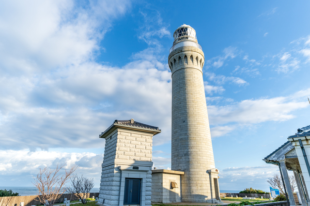 明治9年(1876)に設置され、今なお現役で点灯し続ける白亜の灯台がシンボル。眼下には日本海の絶景が広がり開放感抜群!天候がよければ、らせん階段で展望台へ上がることもできます。