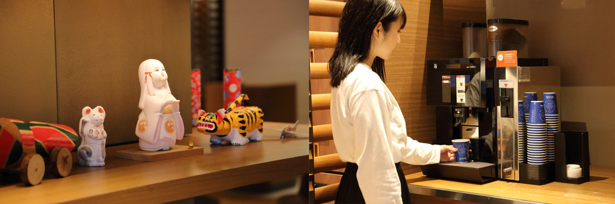 博多人形をはじめとした工芸品が並ぶ理由は、「ホテルをよりカジュアルに、地域を身近に感じて楽しんでほしい」との思いからなのだとか。さらにロビーのドリンクコーナーでは、ホテルおすすめのコーヒーが1杯100円で味わえます。おしゃれなソファに体を沈めて、ゆっくりおウチにいるみたいにくつろいで。