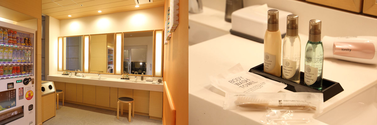 クレンジング・化粧水・乳液が揃っているので、持参しなくて済むのがうれしいですね。パナソニック製のドライヤーやヘアブラシ、ヘアゴム、ボディタオルなどのアメニティも豊富に取り揃えられているほか、自動販売機やウォーターサーバーも併設されているので、快適です♪