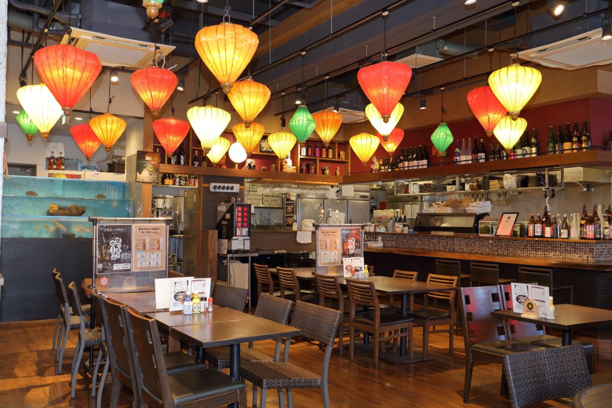 1階の「アジアン磯貝じゃこくじら」でいただけるのは、「博多鯛茶漬け」「季節の魚料理」「季節の肉料理」の3種類から選べる和定食(ドリンクバー付き)。ランタン風の照明が華やかなアジアンテイストの店内で、地元福岡や九州産の旬の食材をふんだんに使用した料理を味わえます。