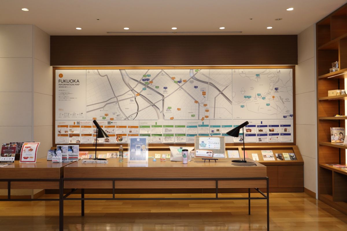 博多を観光するなら、ロビーにある「インフォメーションマップ」をチェック!主要観光スポットだけでなく、グルメやショッピングなどのおすすめスポットが目的別に掲載されていて、観光や食事の場所選びも簡単。フライヤーや各施設で使用できるクーポンなども配布されているので、お出かけ前に立ち寄るのがおすすめです。今回は、ホテルから徒歩で行ける観光スポットをご紹介します!