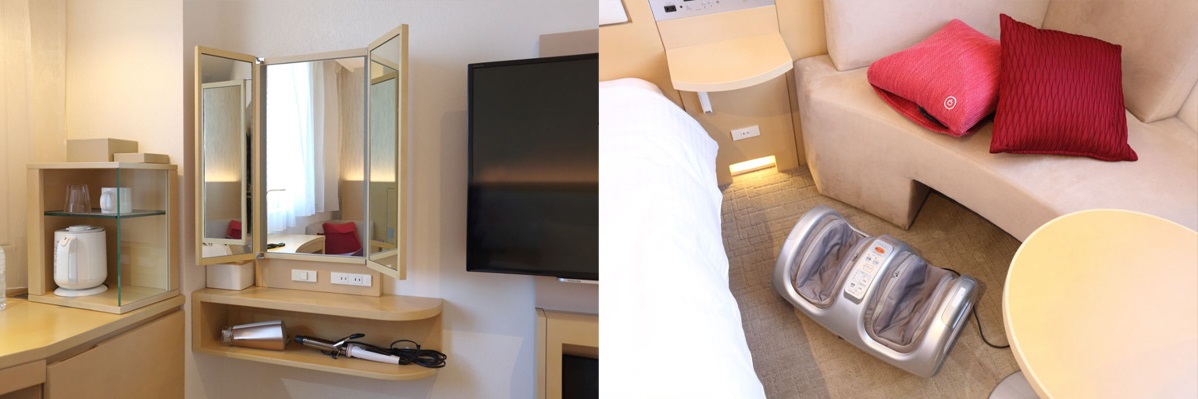「プレミアム レディース ルーム」には、女性にうれしいライト付き三面鏡やヘアアイロン、フットマッサージ機、ナイトスチーマー、ドライヤーを常設。三面鏡の前面部にはコンセントもあるので、座ったままメイクやヘアアレンジができます。またスキンケアブランド「POLA」のクレンジングや化粧水、乳液の用意があるのも、この部屋ならでは。個包装タイプで、使いやすさも抜群です。