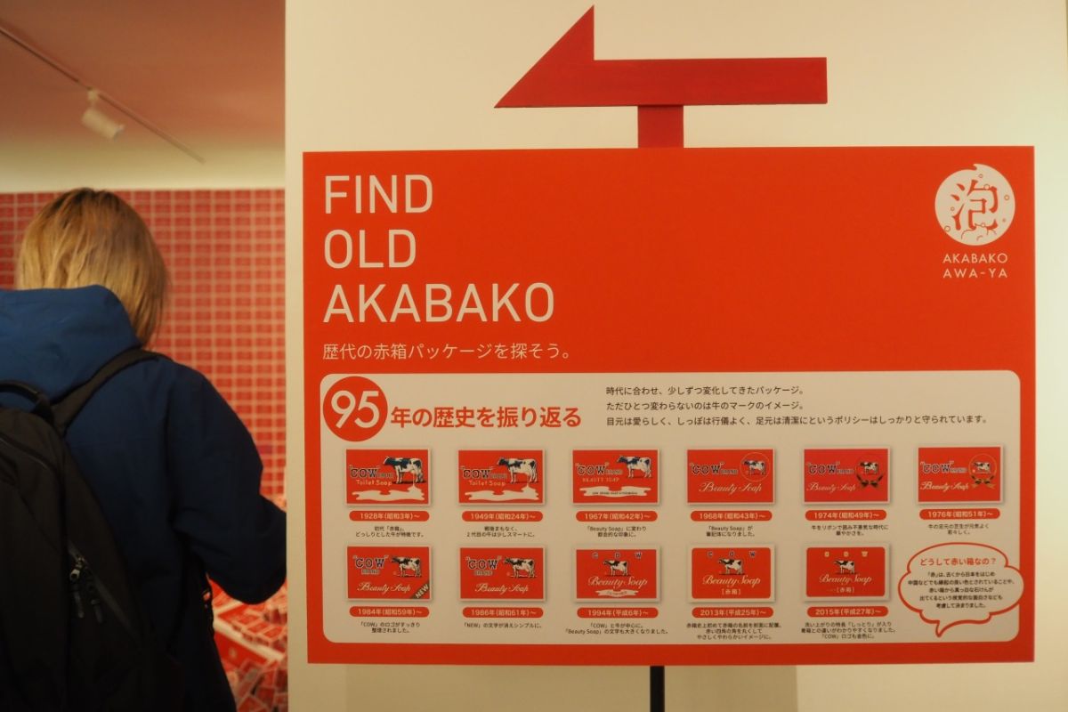 「FIND OLD AKABAKO」と題されたこちらには、無数の赤箱たちの中に歴代パッケージが紛れ込んでいるというお楽しみも。95年という長い歴史の中で少しずつ変化してきたものの、縁起の良さから起用された赤色のパッケージと、牛のアイコンは変わりません。