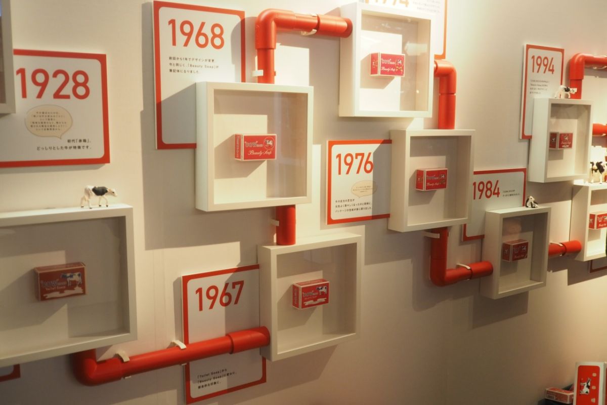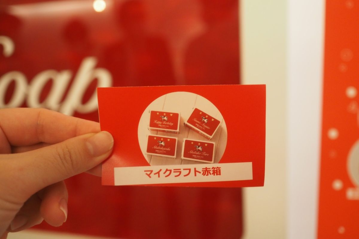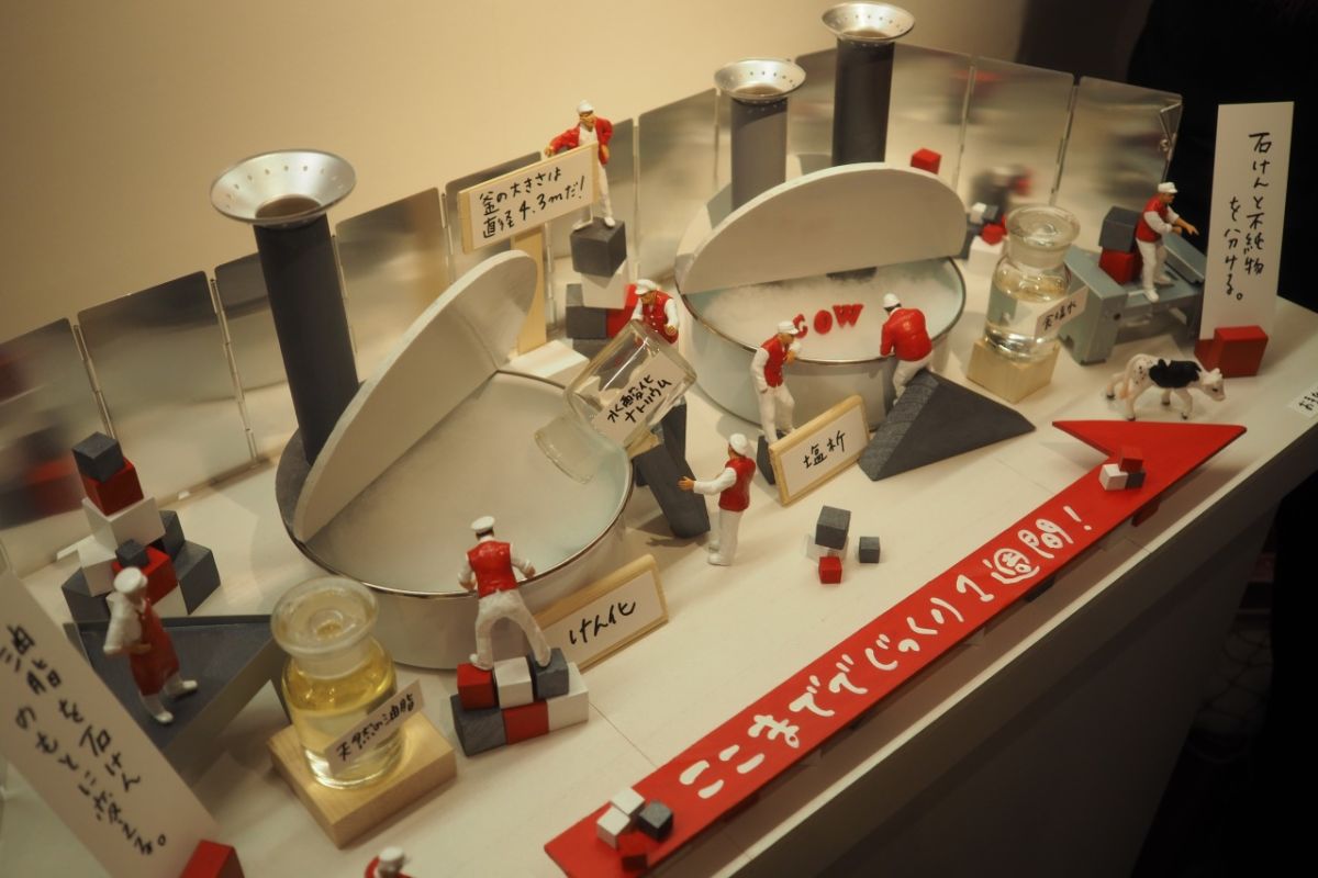 会場全体は”赤箱ファクトリー”テーマとしていて、おしゃれな工場のような内装。赤箱の95年の歴史を振り返ることのできる展示や、石けんが作られる行程を学べるミニジオラマなどを楽しめます。「石けんを作るのに1週間もかかるんだ!」「赤箱だけじゃなくて、青箱もあるの・・・?」なんて新しい発見がいっぱい。