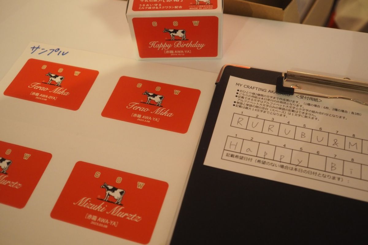 こちらの「マイクラフト赤箱」体験では、赤箱に貼って使えるオリジナルラベルを2種類×3枚ずつ作成することができちゃうんです。文字はアルファベットで14文字以内ということで、「RURUBU&MORE」と、誰かへのプレゼントに使えるように「Happy Birthday」を作ってもらいました。
