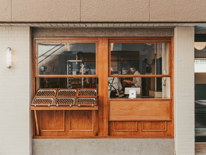 「KURAMAE CANNELE」の1階はテイクアウト専門、2階はカフェになっており、1階と2階で異なるカヌレがいただけます。レトロな建物になじむ店頭の木目調のインテリアがかわいらしく、期待が高まります。