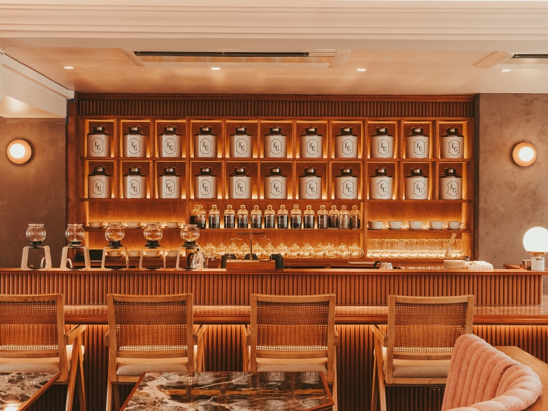 ウッドと落ち着いたカラーを基調とした、シックな雰囲気のカウンターも素敵です。「KURAMAE CANNELE」のロゴがあしらわれた瓶が並ぶ様子は圧巻。入口の近くにはラグジュアリーオーディオが設置されており、素晴らしい音質でBGMを楽しむこともできます。