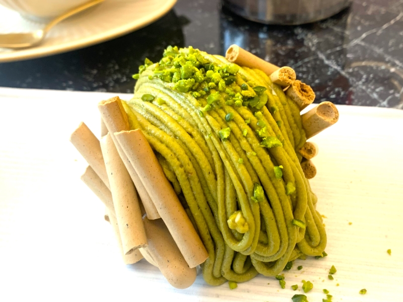 こちらは2023年4月25日(火)まで限定の春の新メニュー「ピスタチオのモンブラン 桜ムース・苺のコンフィチュール・桜葉メレンゲ」。新緑を思わせるようなグリーンのカラーが、春の気分を盛り上げてくれます。一番上にあるのは、メニューの名のとおりピスタチオクリーム。まるでピスタチオそのものを食べているのかと思うほどの芳醇な風味がたまりません!