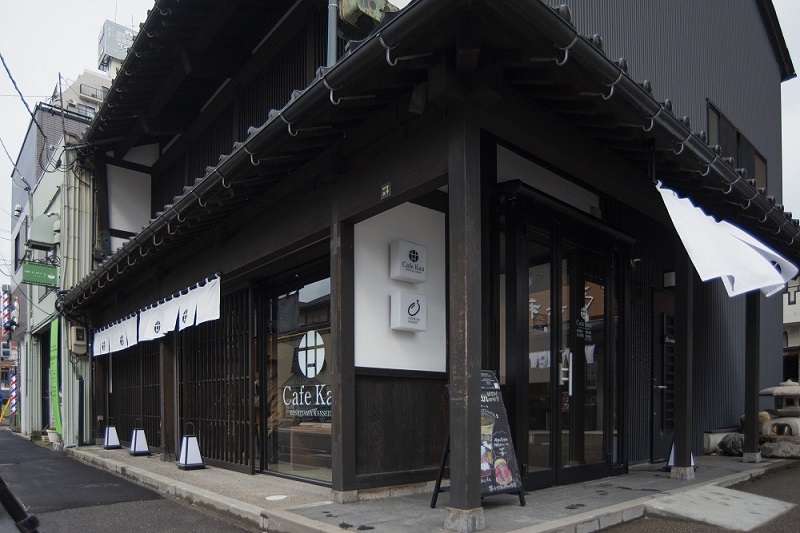 もとは、近江町市場近くの武蔵ヶ辻交差点からほど近い閑静な通りで、「越山甘清堂本店」内に店を構えていた「Cafe 甘 本店」。移転先の尾張町は、ひがし茶屋街や主計町茶屋街にも近い賑やかなエリアで、徒歩での市内観光のルートにも組み込みやすい好立地です。「越山甘清堂本店」も同時に移転し、「Cafe 甘 本店」に隣接する建物で自慢の和菓子などを販売しています。