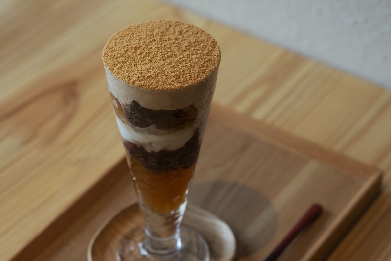 「Cafe 甘」が手掛ける和スイーツの中でも、移転前から不動の人気を誇るのが「加賀棒茶ときな粉のパフェ」。加賀棒茶のゼリー、自家製バニラアイス、きな粉の生クリーム、白玉、粒餡などがグラスの中で層状に重ねられた「Cafe 甘」の看板パフェです。窓際の席から差し込む光に透かして見ると、底の部分で飴色に輝く加賀棒茶ゼリーが美しい!