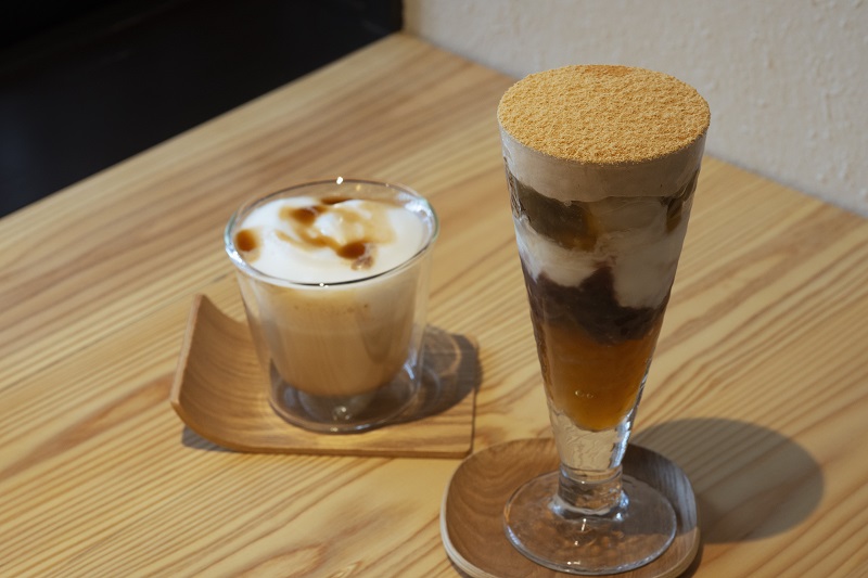 ドリンクメニューにも注目。和菓子の材料で作り上げたラテは、和菓子屋がプロデュースするカフェならでは。中でもオススメは「黒蜜ときな粉ラテ」です。きな粉はパフェにも使われていた一級品。黒蜜も「越山甘清堂」の和菓子職人さんが材料一つ一つにこだわって手掛けた自家製で、同店の和菓子にも使われています。香り高いきな粉と黒蜜の濃厚な味わいが特徴の一杯です。