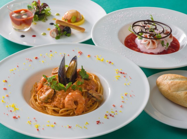 スペシャルセット(前菜:シーフードのアスピック、トマトと桃のスープ モッツァレッラ添え、マッシュポテトとクルミの生ハムカネロニ仕立て、サラダ、スパゲッティ:海老とムール貝の蟹トマトクリームソース、パン、リコッタムースとストロベリーソース)3600円