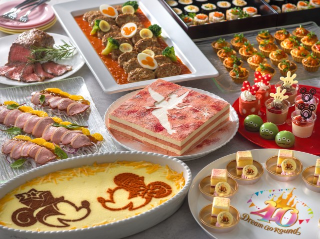 ココアパウダーでミッキー、パプリカパウダーでミニーをデコレーションした「シェパーズパイ」(写真左下)。ブルーパウダー、イチゴパウダーで華やかな色合いをイメージした「ショートケーキ」(写真右下)。ティンカーベルが魔法をかけている様子をイメージした「マスカルポーネケーキ」(写真中央)。40周年のロゴが入ったチーズが添えられた「トマトソースのハンバーグ」(写真中上)。これらの料理がブッフェ台に並びます。