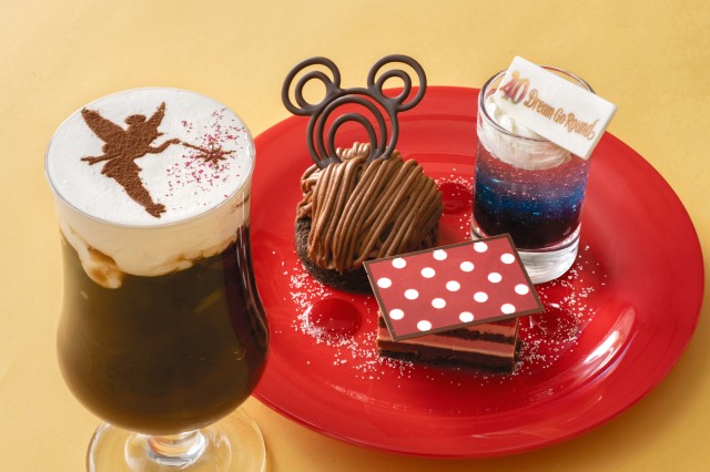 こちらのセットには過去に人気のあったアイスカフェモカがついてきます。40周年仕様のカフェモカにはティンカーベルがプレートに魔法をかける様子をイメージ。コーヒーの味わいを感じられるバランスのよさが◎。クラッシュゼリー入りで食感も楽しめます。