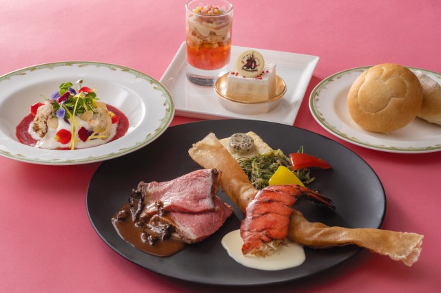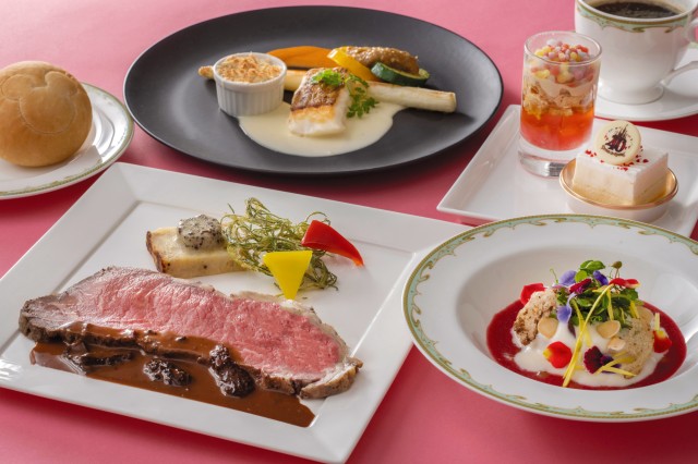 スペシャルディナーコース前菜:チキンと鶏レバーのムース ライムのフォームとラズベリーソース、エディブルフラワーとアーモンドを添えて、魚料理:真鯛のポワレ ホワイトバルサミコのバターソース、ムール貝と小柱のグラタン、肉料理:ローストビーフ、モリーユ茸のソース、デザート:バニラマスカルポーネクリームとピーチのヴェリーヌ、チーズケーキ、パン、コーヒーまたは紅茶)7400~9800円(写真はローストビーフ80gをチョイスしたコースで7400円)
