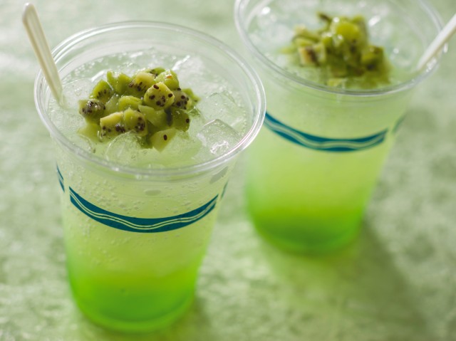 鮮やかなグリーンが印象的。キウイフルーツの甘みとジンの苦味でバランスのとれた味わいに。キウイの果実もトッピング。8月31日(木)までのメニュー。