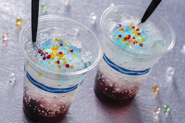 海底の珊瑚を思わせるコーラルピンクから海をイメージしたブルーゼリー、透明感のあるクリアなシロップへとグラデーションが美しいドリンク。