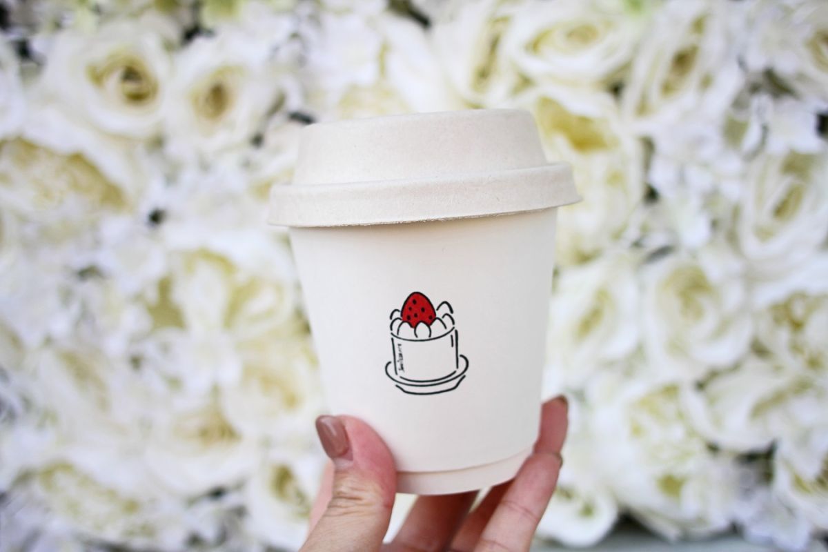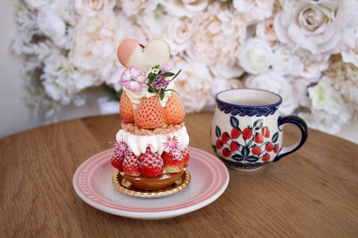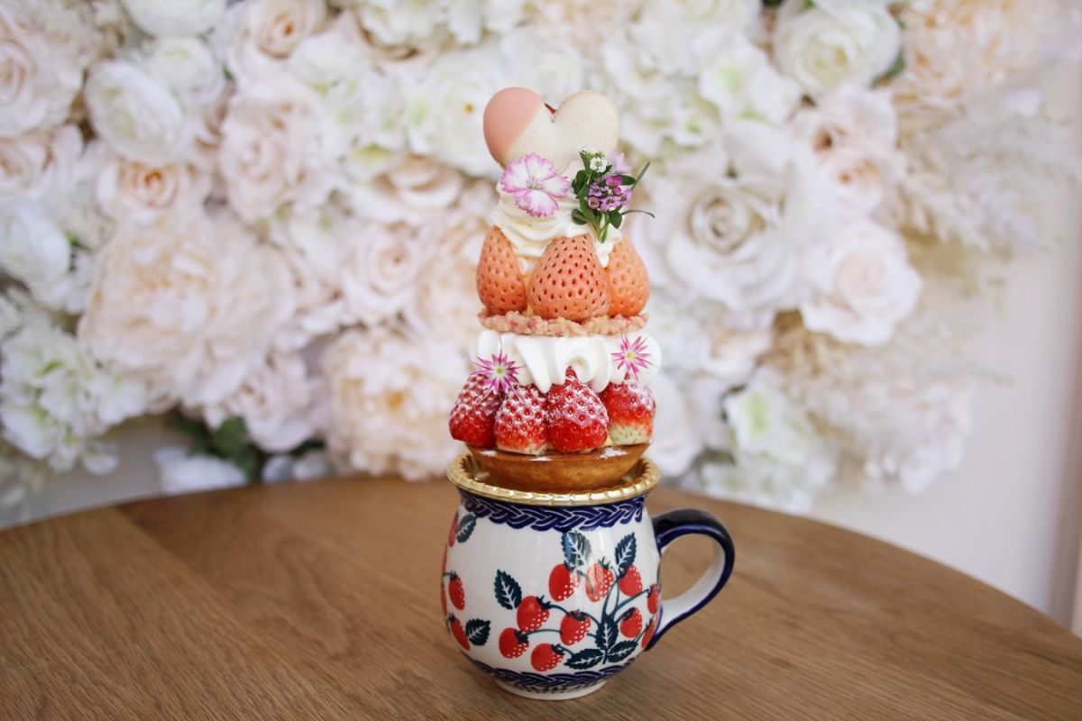 イートイン専用の「イチゴのパフェタルト」(ドリンク付き)1850円は、ポーランド製ポーリッシュポタリーのマグカップの上にパフェタルトが乗せられています。見た目がとっても華やかで、映える写真が撮れること間違いなし♪