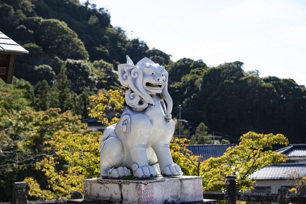 鳥居はもちろん、境内はあらゆるものが磁器製。神社の狛犬、社(やしろ)の欄干(らんかん)、大水瓶なども磁器なんです!