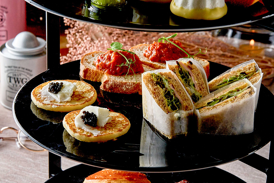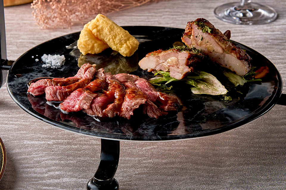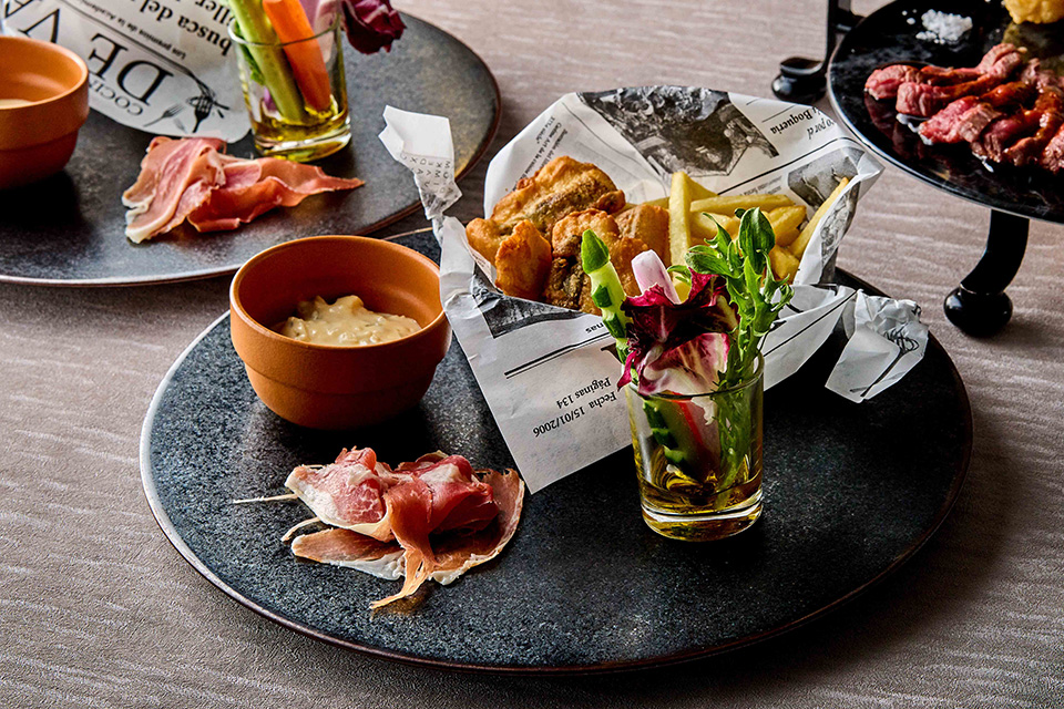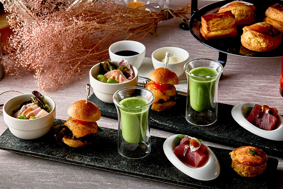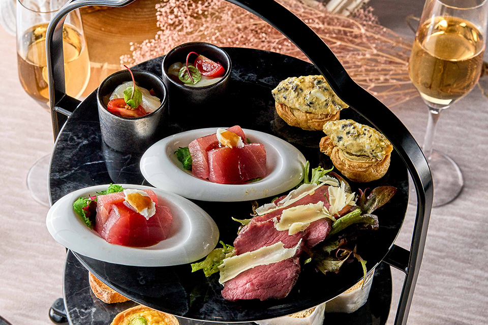 夜限定のトワイライトハイティーでは、食材にこだわりバラエティーに富んだフィンガーフードの数々が揃います。空豆のほくほく食感が楽しめるキッシュや筍の食感を楽しめるフリットなど旬の食材を生かした品々に加え、牛リブステーキなどボリュームにもこだわった品々が楽しめます。