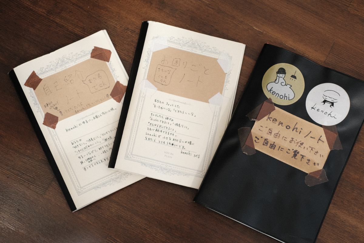 また、お客さん同士を心地よくつなぐノートとして「お困りごとノート」と「自己紹介ノート」が活躍しています。過去には、絵本の脚本を書きたい人とイラストレーターが出会い、絵本が生まれたこともあるそう。時に人とつながれるのも「kenohi」ならではの魅力です。
