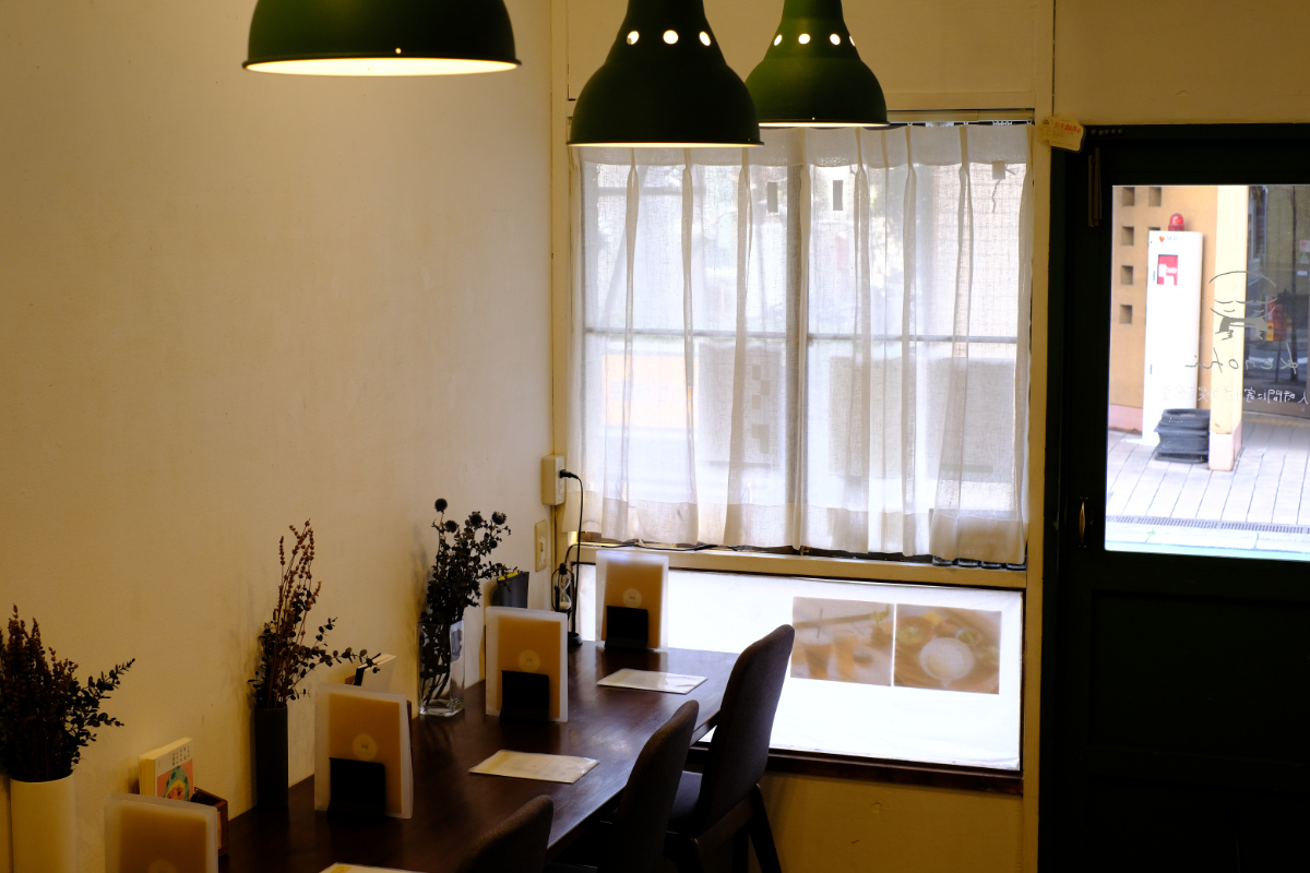 いざ、入店。店内は、月日を感じる窓や、レトロなライトが懐かしい雰囲気を醸し出しています。お店を囲む白壁は、オーナー自ら塗ったそう。この手作り感が温かさを感じるポイントなのかも。
