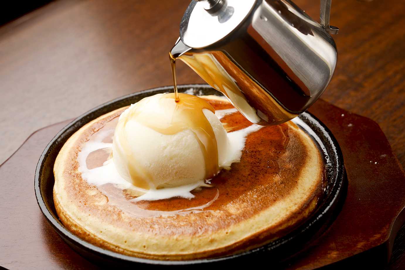 「プレーンパンケーキ&アイスクリーム」は、人気のパンケーキメニュー。アツアツの鉄板の上でメイプルシロップをかけると、シロップがグツグツと音を立てます。甘すぎず、ふわっとした食感のトリコになってしまいそう。