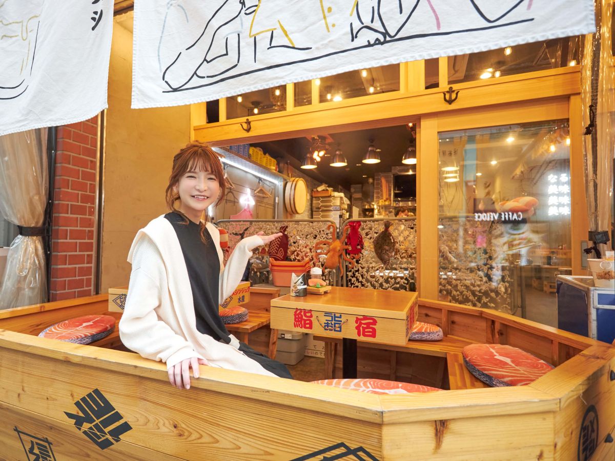 実はここ、新宿三丁目交差点から目と鼻の先にある寿司飲み屋「魚学マニア スシンジュク」のテラス席なんです。暖かくなるこれからの季節は、船形のテラス席で行き交う人や車を眺めながら食事やお酒を楽しむのもおすすめ。