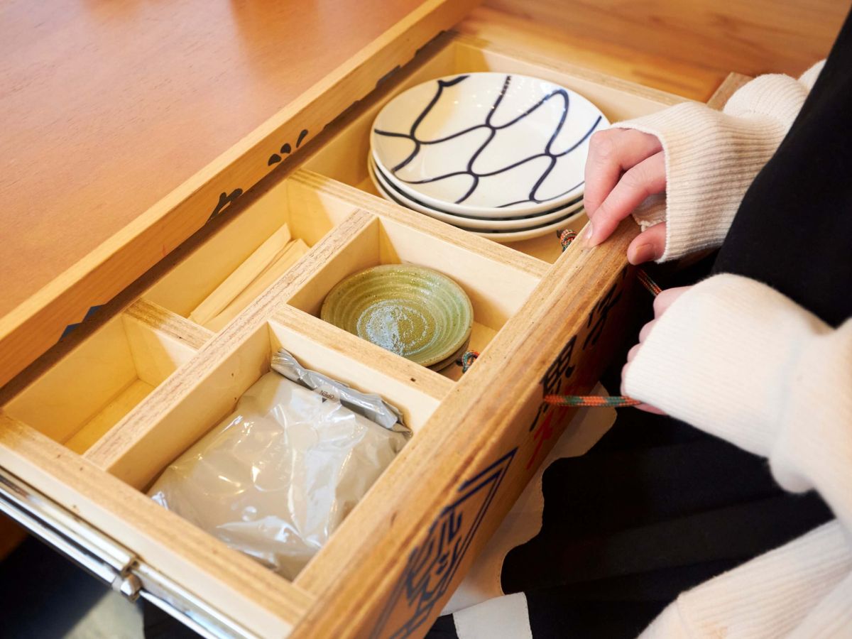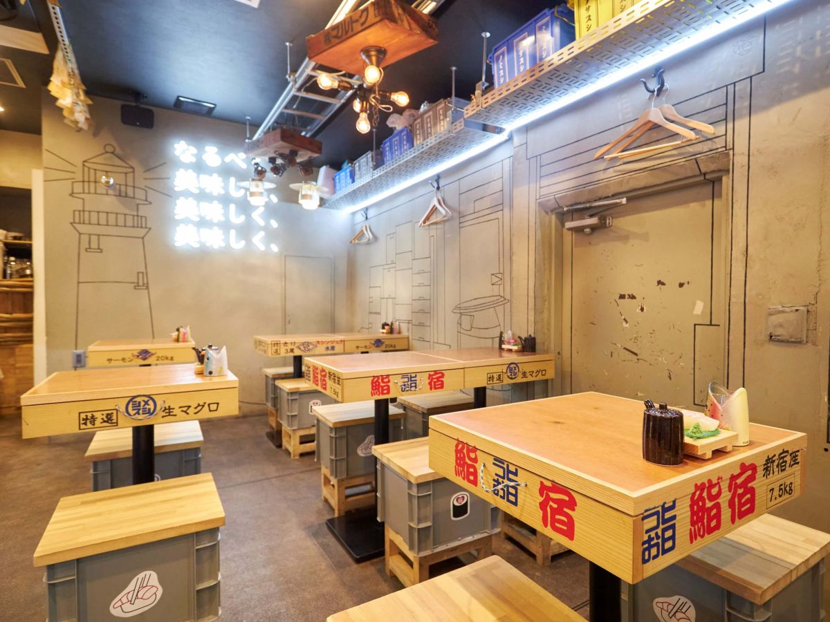 市場を再現したという店内にも遊び心がいっぱいです!壁面に大きな灯台が描かれていたり、木製のばんじゅう(薄型運搬コンテナ)で造ったテーブルを開くと、食事の際に使うお皿が入っていたり♪ お手洗いにもおもしろい工夫が施されているので、ぜひチェックしてみてくださいね!