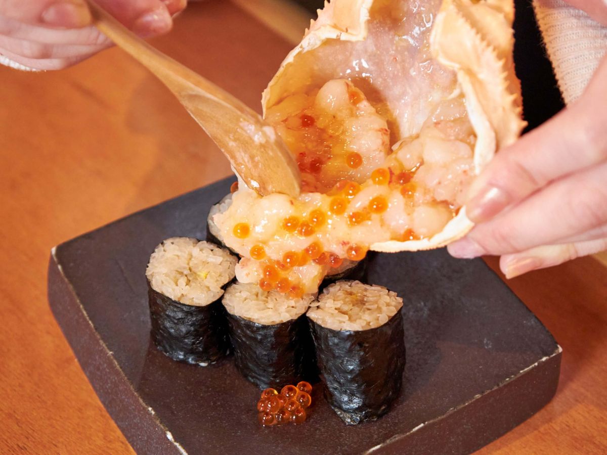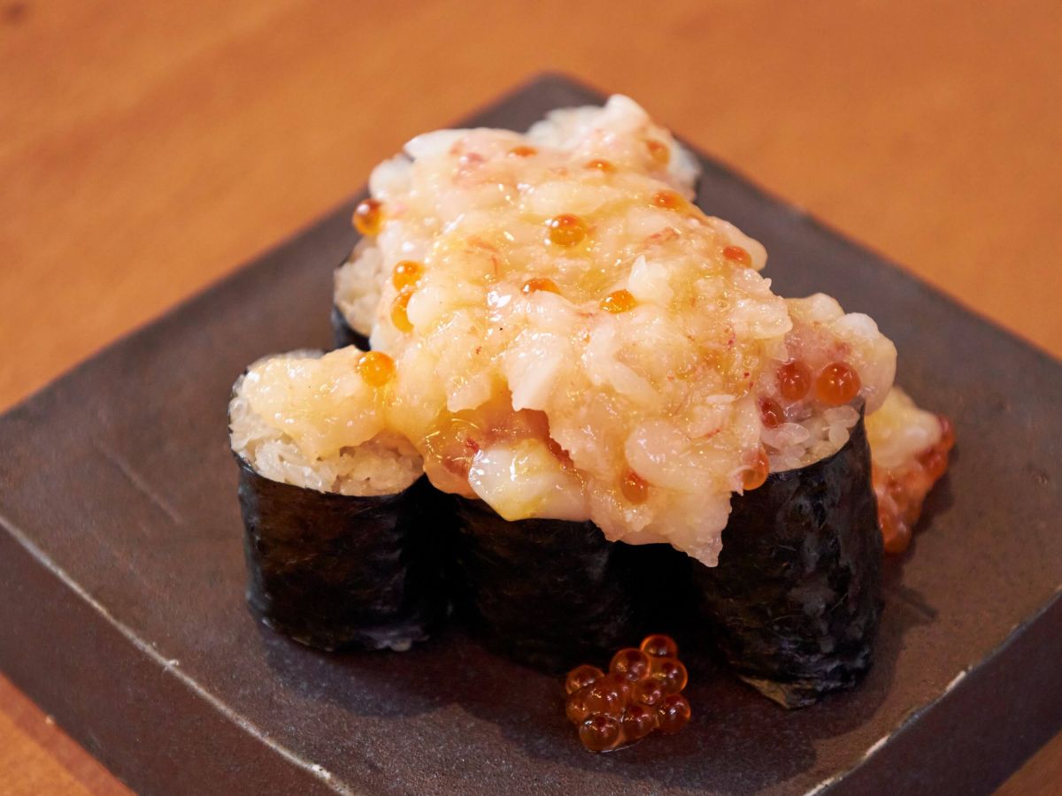 エビとカニのプリプリ感と口の中でプチプチと弾けるイクラの黄金のハーモニーは、至極の味♪カニミソと柚子皮を利かせた海苔巻きと一緒にいただくと、コクや甘みがさらに高まりますよ!