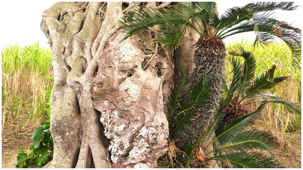 この木は謎が多いだけでなく、島の成り立ちを感じられるみどころも。幹の根元をじっくり見てみると…、木の根にサンゴ礁が包み込まれている不思議かつ貴重な光景が。これは、はるか昔に今は陸地になったこの場所が海だったことを表しています。海中のサンゴが盛り上がり陸地になり、その陸地に植物が生えるタイミングに海の名残であるサンゴ礁が根に飲み込まれたことによりこの不思議な形に落ち着いたそうです。