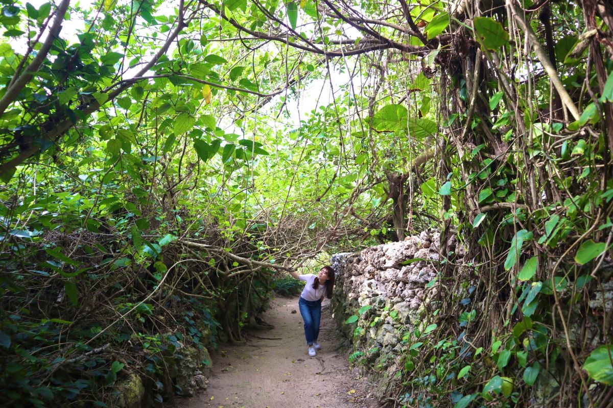空港から車で約8分の場所にある「トトロの道」は、実際にいまも地元の方が暮らしている仲間集落の前にある道。道の左右に生える植物たちが低いトンネルをつくり、まるでまるであの有名映画の世界に迷い込んだような気分になります。