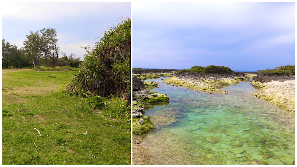 道を歩いた先では突如開けた緑地(写真左)にたどり着き、さらにその向こう側には海(写真右)が広がります!海の手前は浜辺が広がっており海水の近くまで歩み寄ることができます。