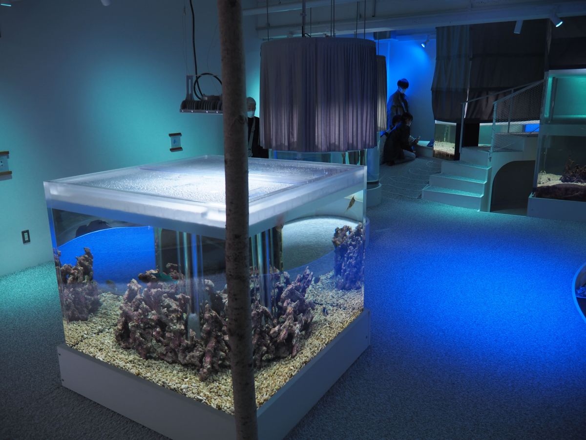 館内は、「川べりの教室」「潮騒の教室」など、展示される生き物に応じてさまざまな教室に分けられています。こちらの「海辺の教室」は、靴を脱いで上がる展示室となっており、くつろぎながらチンアナゴやクラゲの生態を観察できます。