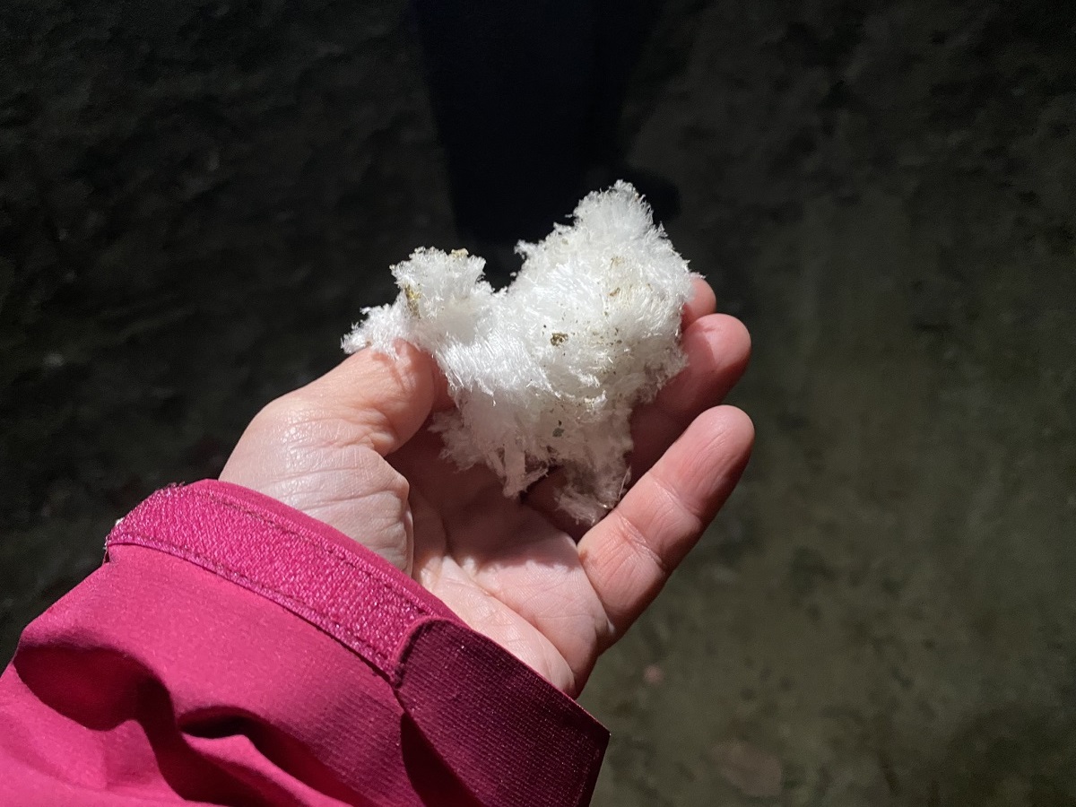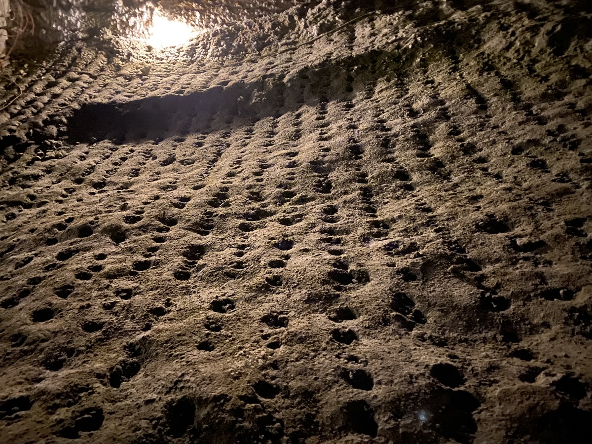 さていよいよ地底湖へ。鉄の門扉を開いて中へ入ったところで、「これからあえてライトを消してみます。前の人の背中に手を当てて迷わないように進んでください」とガイドさん。ライトが消され、目を開けても閉じても変わらない坑内はほんとうの闇。ふだんできないレアすぎる体験です。