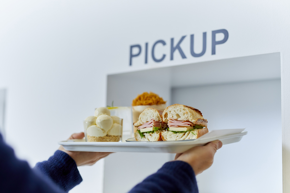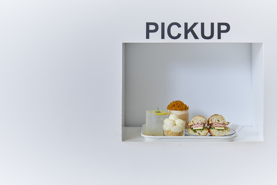 白いカウンターで注文したら、あとはセルフスタイル。オーダーしたメニューができたら、「PICKUP」へ取りに行きます。