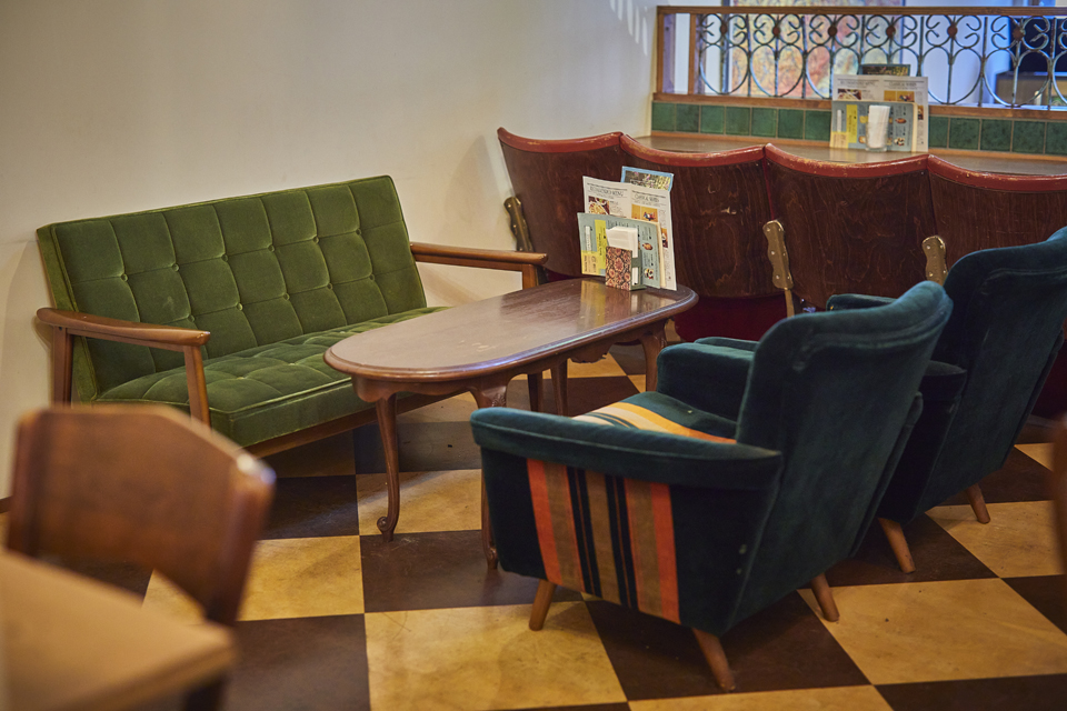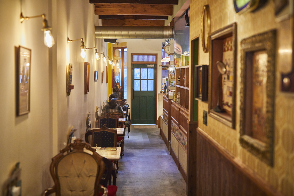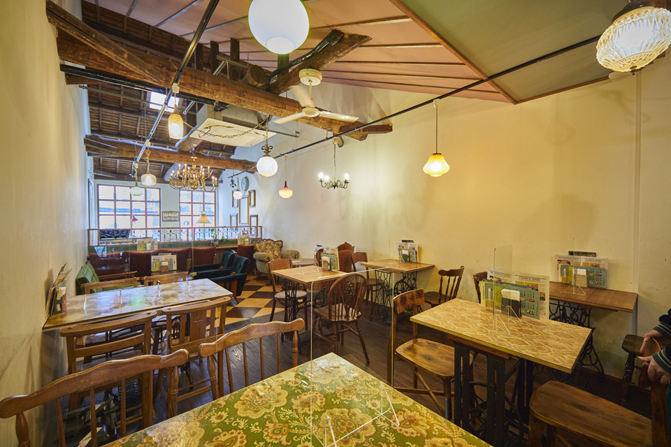 一人ならテーブルが一列に並んだ1階席もおすすめ。ランプや額縁など、こちらもノスタルジックな雰囲気が漂います。