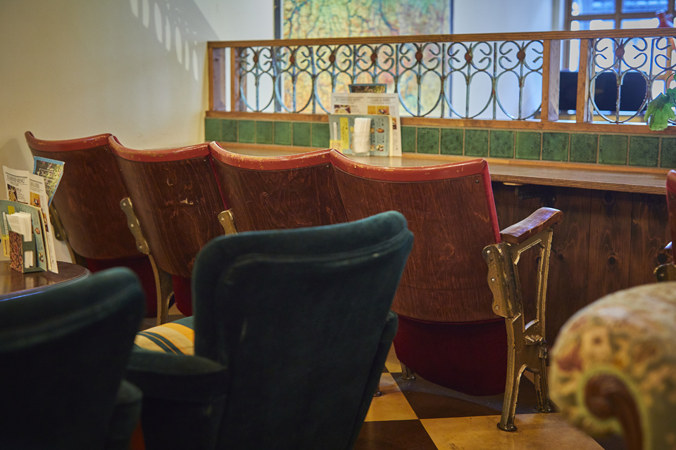 2階には劇場のチェアややミシン台を利用したテーブルも!何度でも足を運びたくなる、遊びゴコロに満ちあふれた空間です。
