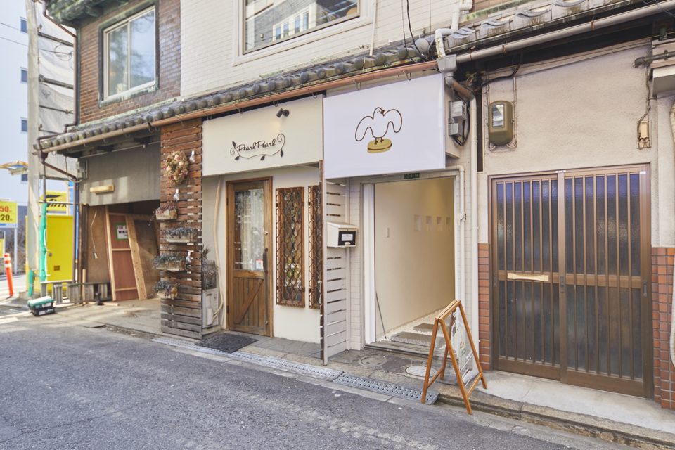 地下鉄中崎町駅から徒歩3分、JR大阪駅からも徒歩15分の住宅街にある「coucou amande」。韓国っぽカフェとして有名な北浜の「カフェ スコーン」の2号店で、こちらはダックワーズの専門店。写真の真ん中にある鳥の看板の下が入口で、奥に続く細い通路に入って行きます。