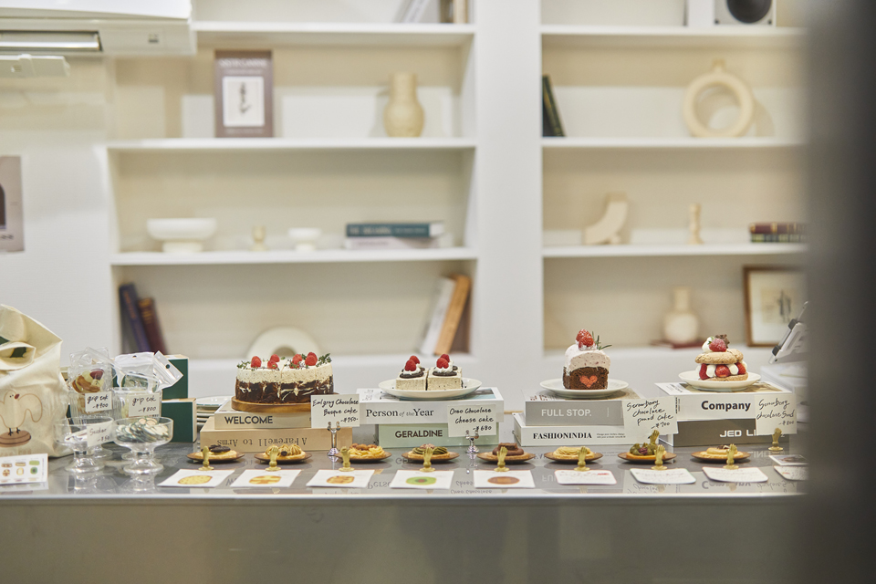 細い路地を進み扉を開くと、ダックワーズのサンプルや、可愛らしいデザインのケーキが並ぶショップスペースが広がっています。