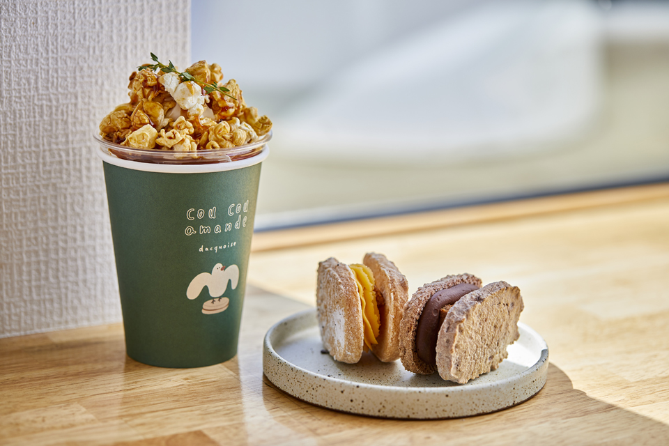 2階のカフェスペースではダックワーズ1個からイートインOK。キャラメル掛けされた甘いポップコーンがたっぷりのる「ポップコーンキャラメルラテ」ほか、ドリンクメニューも充実しているのでぜひ一緒に味わってみて。